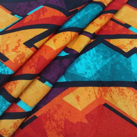 Tecido Microfibra Africana Tuareg, com estampa geométrica vibrante em azul, vermelho e verde. Ideal para roupas e decoração que expressam identidade cultural.